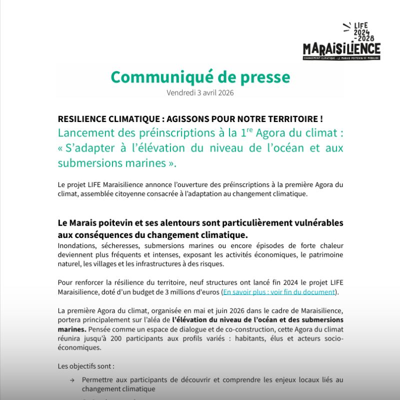 Le projet LIFE Maraisilience annonce l’ouverture des préinscriptions à la première Agora du climat, assemblée citoyenne consacrée à l’adaptation au changement climatique. Réunissant jusqu’à 200 personnes (habitants, acteurs socio-économiques et élus), elle permettra de recueillir...